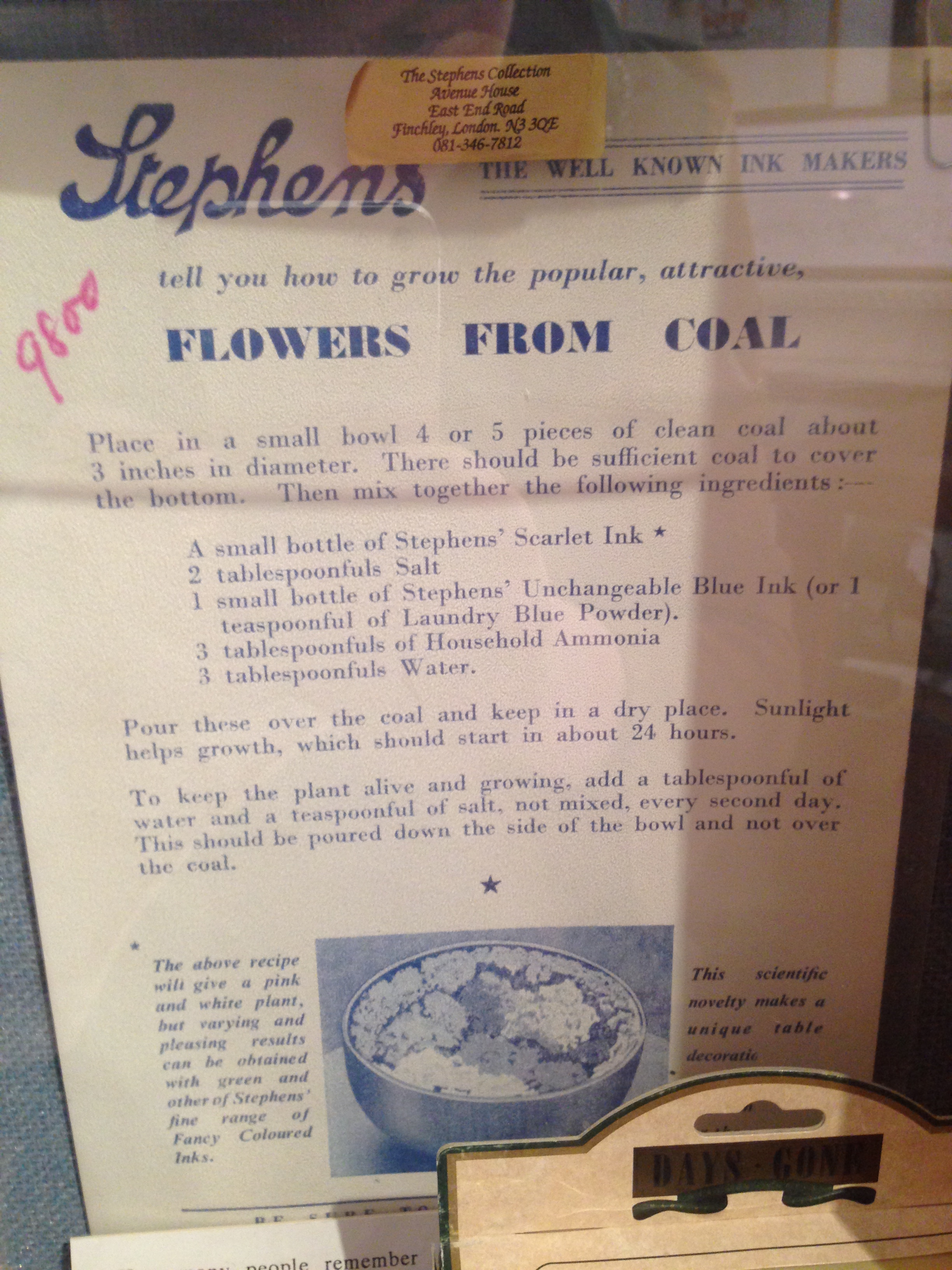 One formula he created for black ink (c. 1910) included 1lb of crushed galls in 12 pints of soft water, heated to boiling, before adding 8oz green vitriol and bottling. The bottle was then shaken daily for several weeks before 6oz of gum was added, it was strained and then rebottled. Hard work to produce!