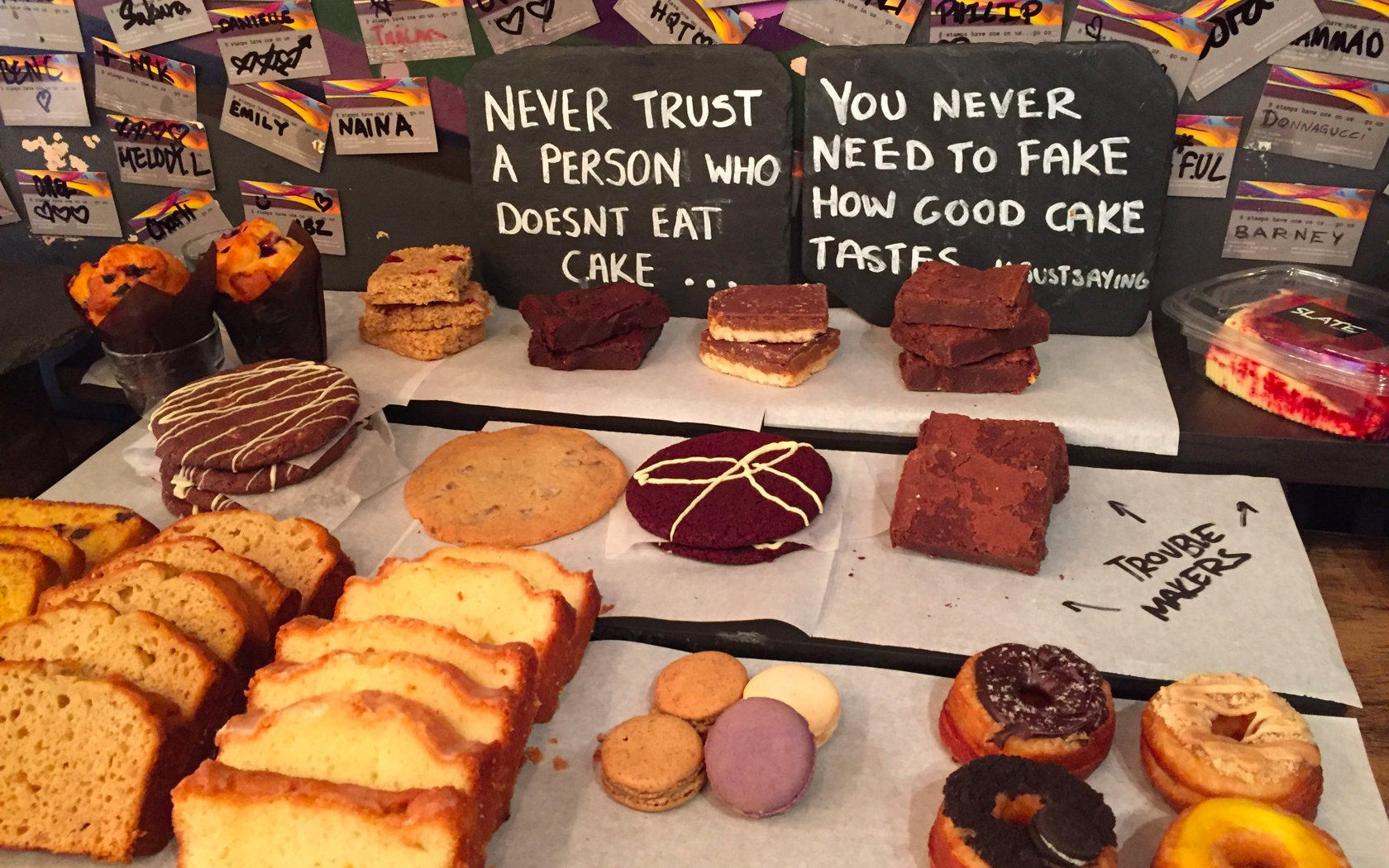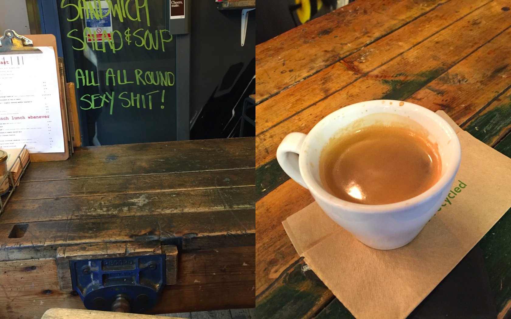 Small place. Very busy on the eyes. Wooden floor. Spraypaint decor. Left wall covered in signed loyalty cards. Empty except for staff. B-52’s playing on the CD player. Plenty of pastries, cookies, cakes. Backed by chirpy blackboard descriptors. T-shirts for sale, hanging from the ceiling. Imagine it’s steamy when full. Cyclist vibe with bench by outside window. Reclaimed and uncomfortable furniture. Fast wifi.